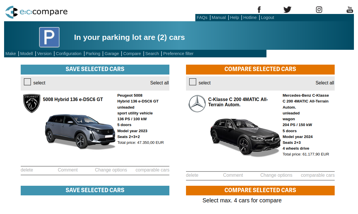 The parking saves all configured vehicles of the current browser session. The driver does not lose any ‘configuration work’ of a session and can switch between vehicles at will. The driver can enter and change names and free descriptions for his vehicles in the parking lot.